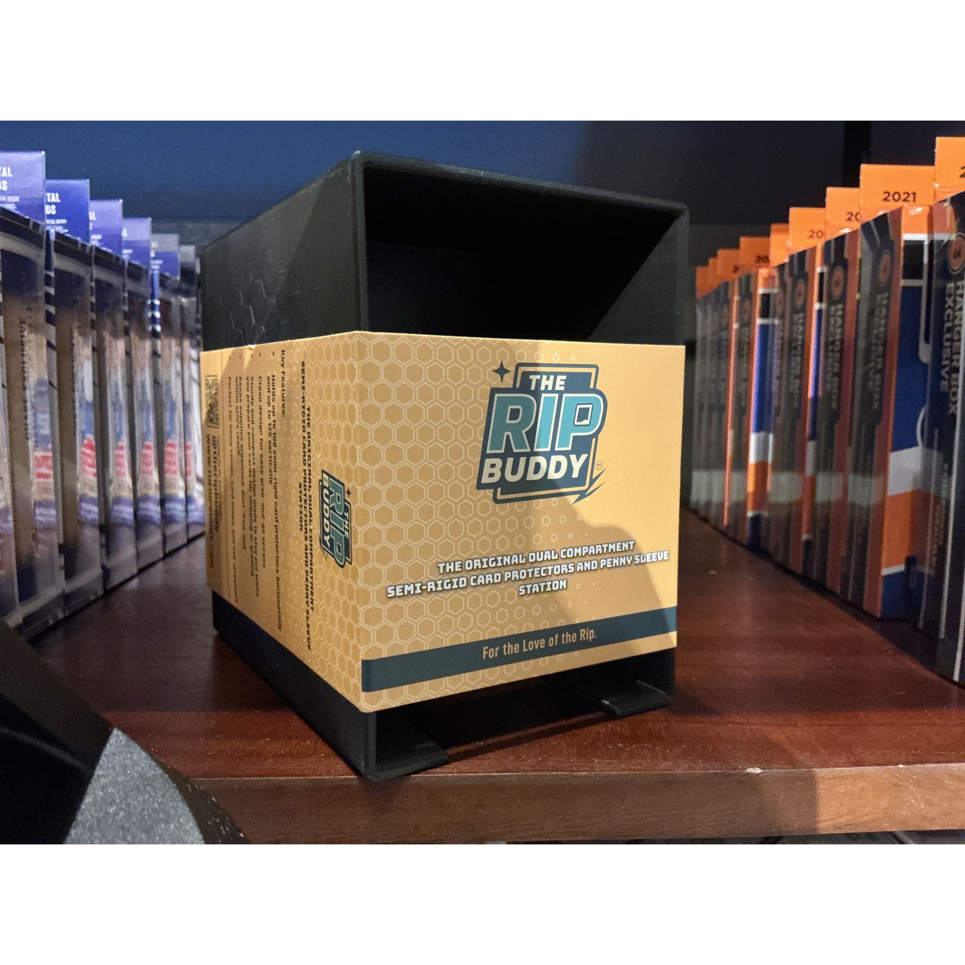 Dual compartment. Semi-rigid card protectors & penny sleeve station